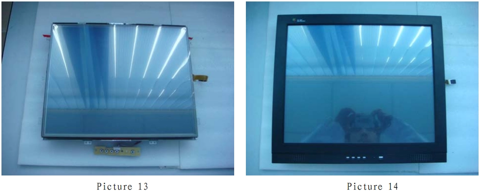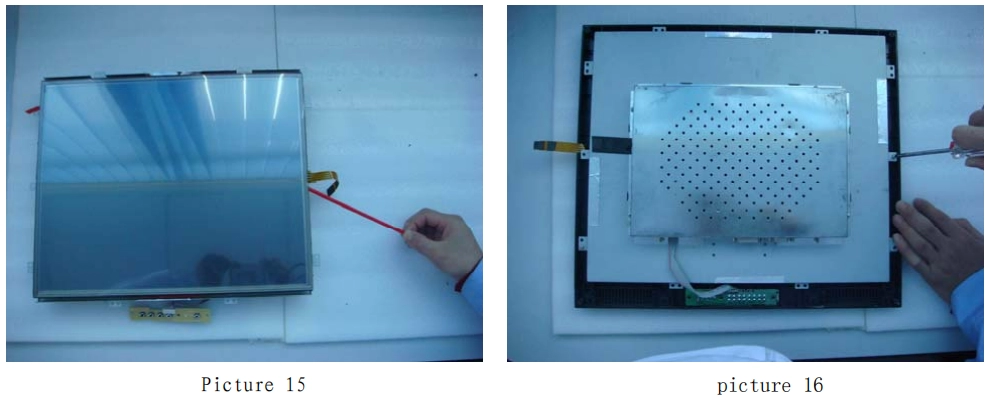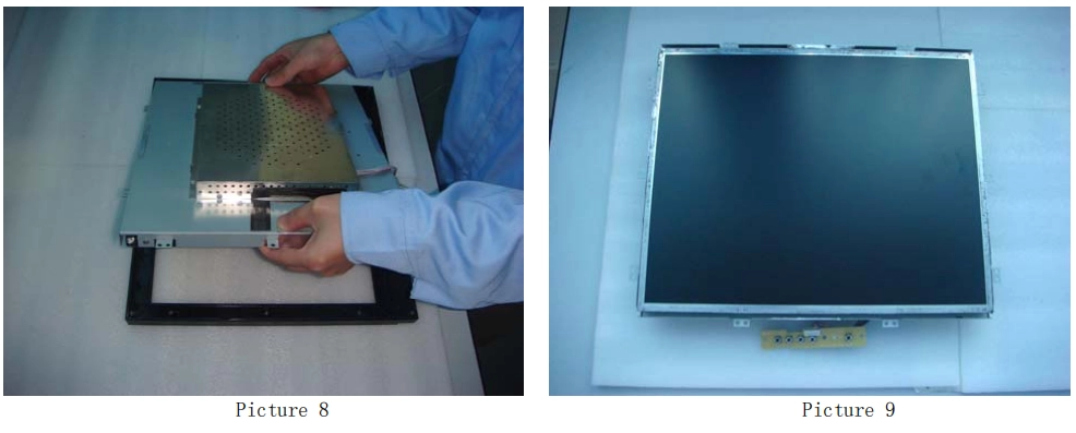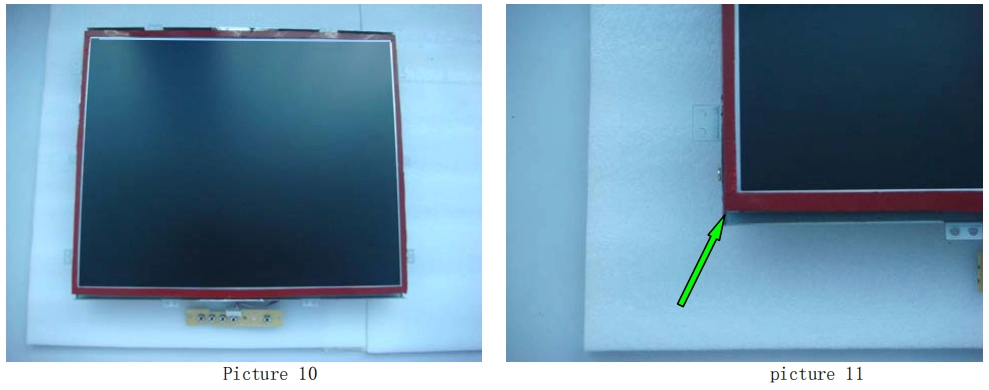 4. Retire el módulo LCD (como se muestra en la imagen 8) y guárdelo en la caja fuerte, como se muestra en la imagen 9. A continuación, coloque con cuidado cinta adhesiva de doble cara en los cuatro lados del monitor (como se muestra en la imagen 10). Recuerde no pegar la cinta adhesiva de doble cara sobre la zona táctil (como se muestra en la imagen 11).